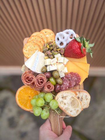Mini pre-made charcuterie cone/cups. Includes two types of cheeses, salami, crackers, fruits, nuts, and olives. Can customize! Also, for 100+ guests, includes customized stickers to match your event.